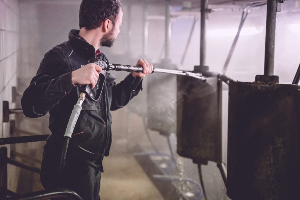 Bei der Reinigung von Stallungen ist eine hohe Wasserdurchflussmenge zum Abspülen besonders von Vorteil hier kommt häufig die CLENA Serie M2500 zum Einsatz.